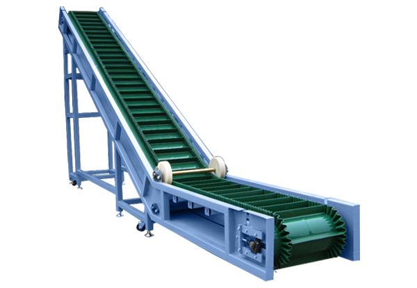 大傾角皮帶輸送機(jī)又稱擋邊帶式輸送機(jī),其結(jié)構(gòu)是在平形橡膠運(yùn)輸帶兩側(cè)粘上可自由伸縮的橡膠波形立式“裙邊”,在裙邊之間又粘有一定強(qiáng)度和彈性的橫隔板組成匣形斗,使